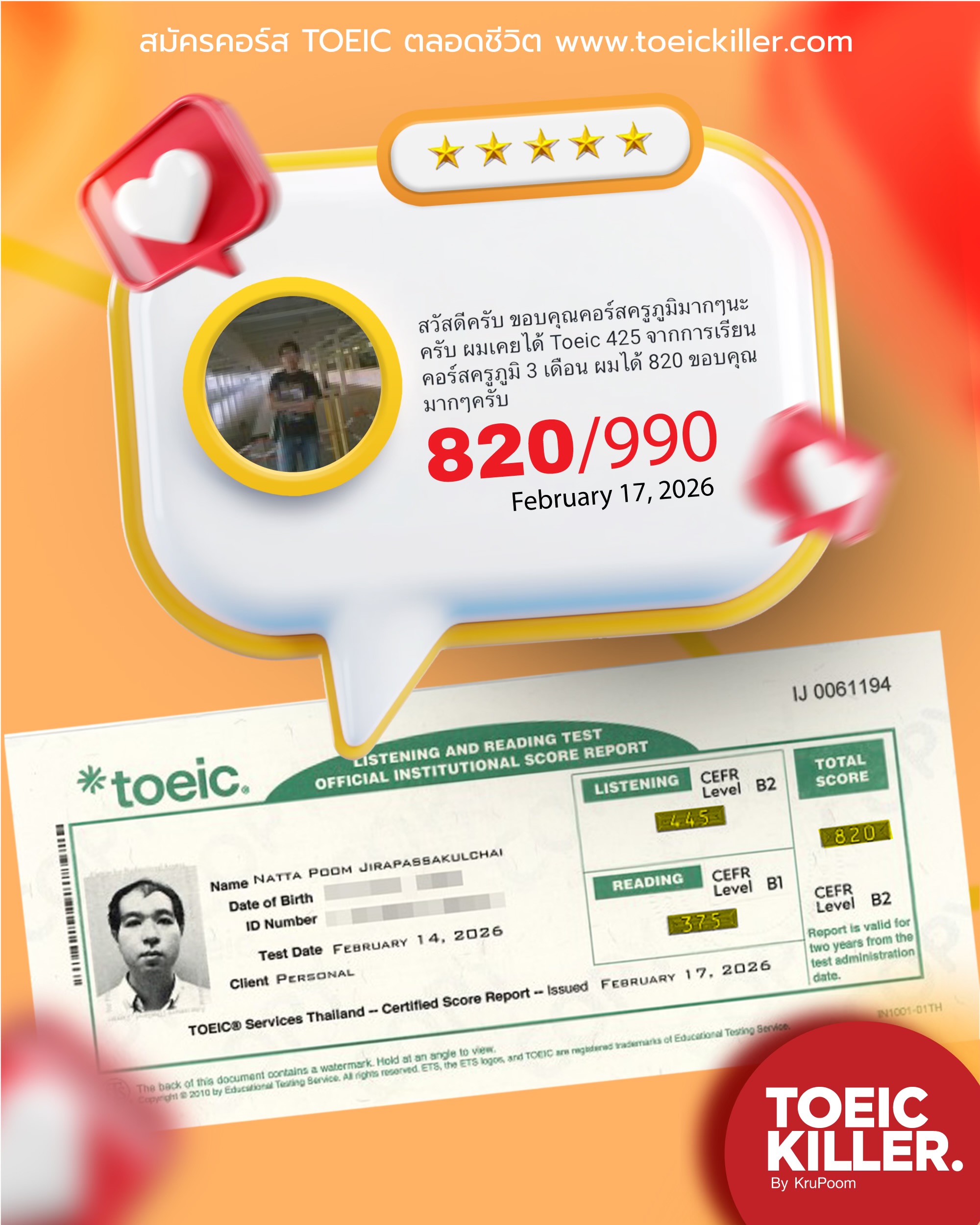 TOEIC เต็ม 990/990 (ผลสอบครูภูมิ มี.ค. 2026)